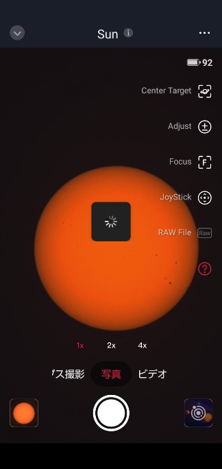 1)M13のは今迄の設定での普通の天体の撮影画像。(自宅の環境悪く、これが精一杯)2)太陽のは解決前のスクショで、 中央のクルクルがいつまでも出て、撮影終了に なりません。これはスタック撮影・処理の時と同様のサインと思います。撮影者 谷川氏 |