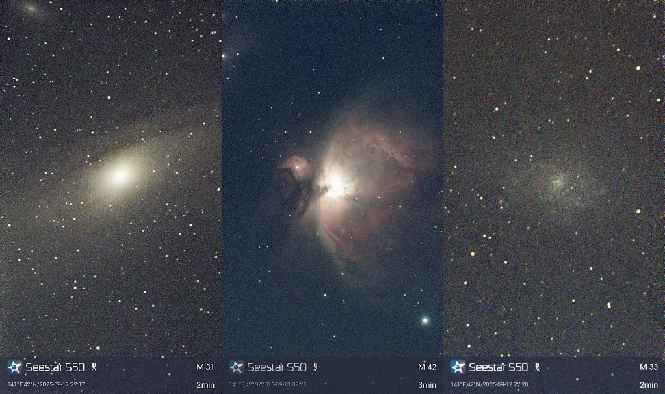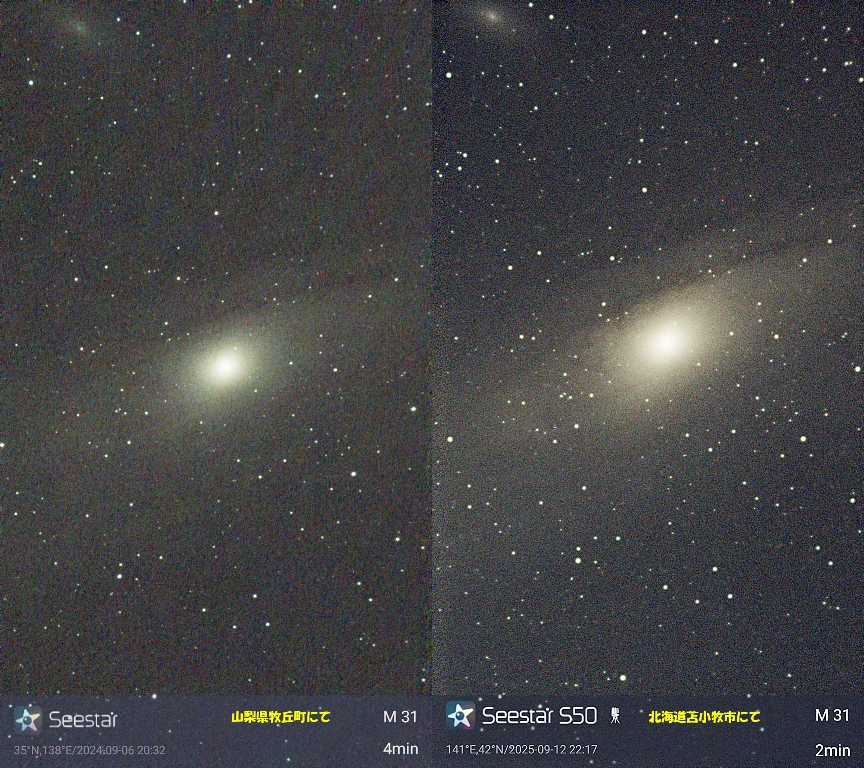 撮影地でどの程度違うのか比較してみました。北海道苫小牧では2分で山梨県牧丘と同じ程度に写ります。撮影者 谷川氏 | |