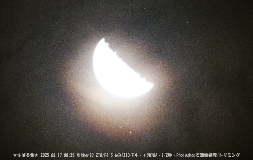 昨夜はスバル食でした。雲が多くて満足に見れませんでしたが、それでも何とか雲の切れ間に見えました。