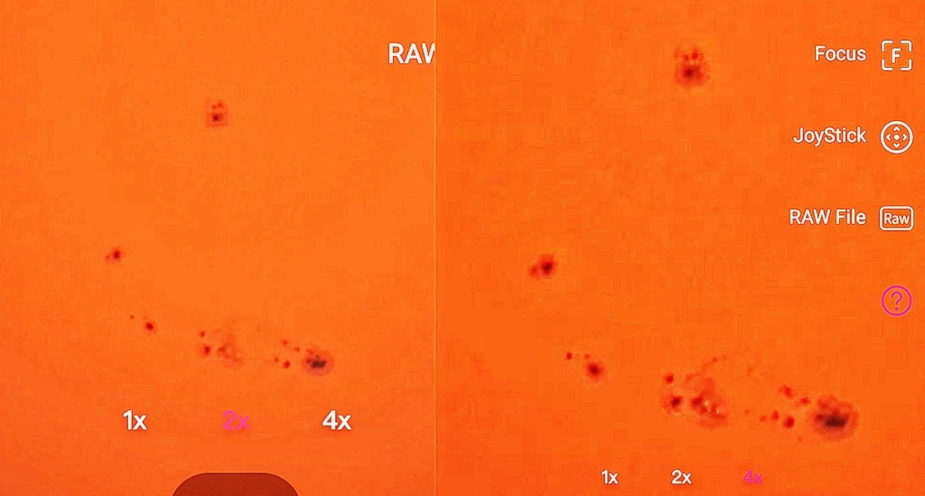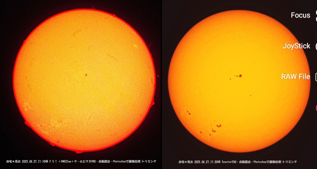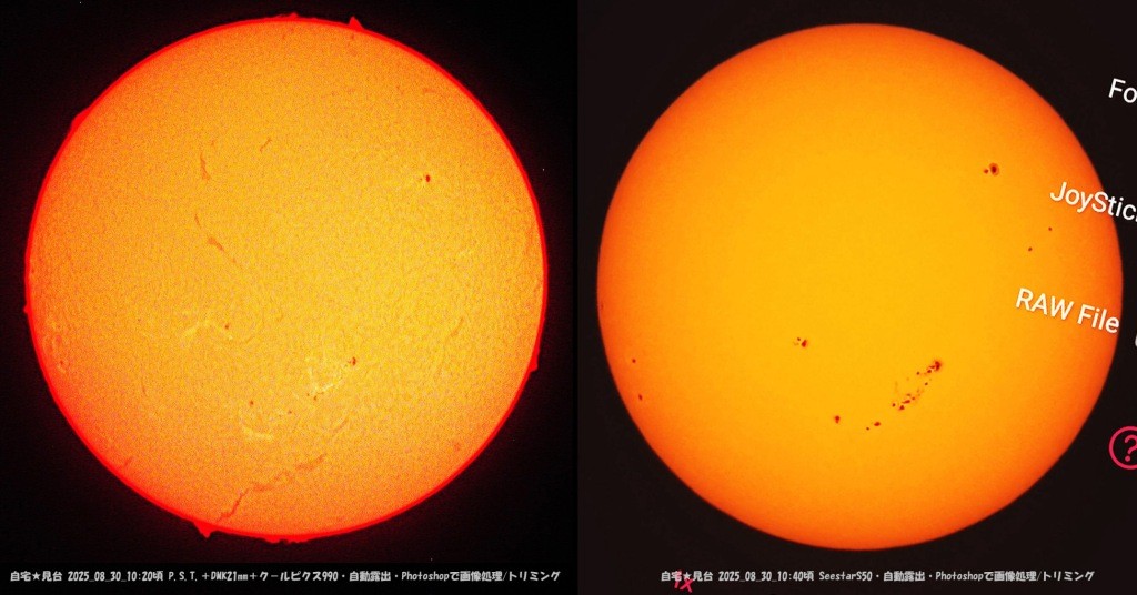 | 大きな黒点群は今が盛りのようです。肉眼では見えません。画面右の余計な文字はSeestarS50がスクショしか出来なくなったので、仕方なく入れました。撮影者 谷川氏 |