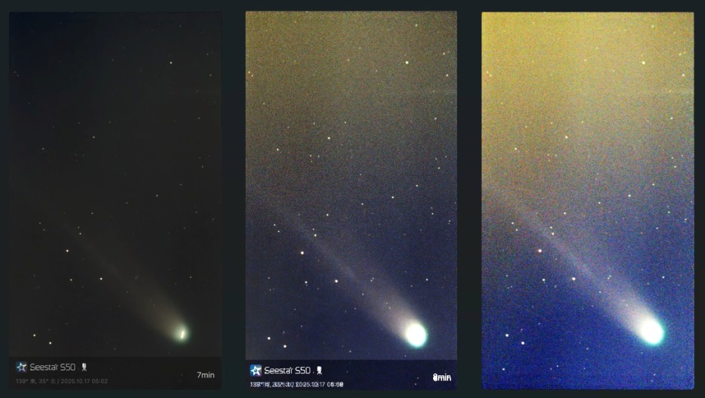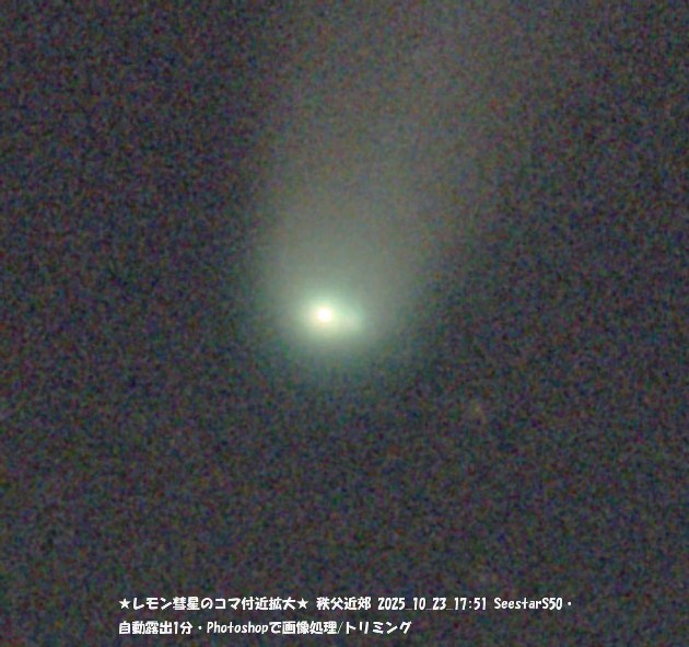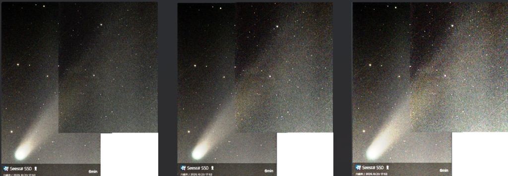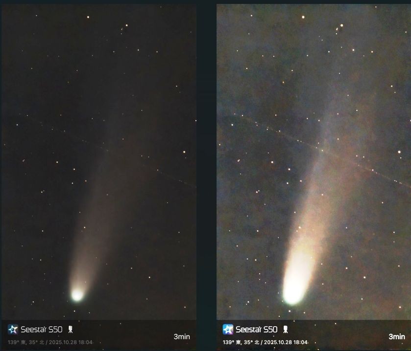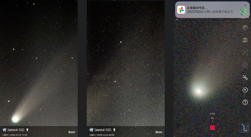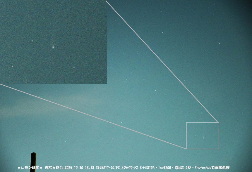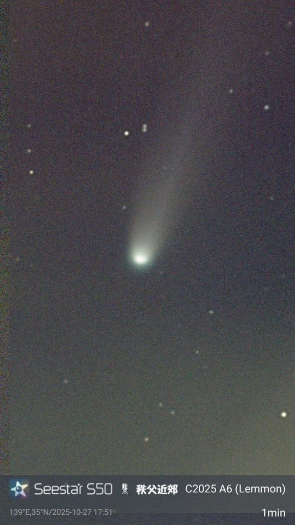ここでは、川越天文同好会の会員の画像を集めました。 「2025A6(レモン)彗星」 左は、オリジナルです。右は画像処理してあります。撮影者 関口氏 観測地はかなり雲がありましたが、何とか隙間から撮影出来ました。撮影者 谷川氏 コマ付近は分裂したか、他の恒星があるのか2つの輝点があります。撮影者 谷川氏 撮影者 関口氏 撮影者 浅井氏 撮影者 関口氏